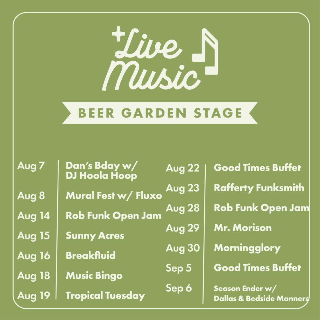 The Beer Garden has its own stage that features local musicians and DJs on select nights of the week! Check out our lineup for upcoming shows that are featured 6-9pm.